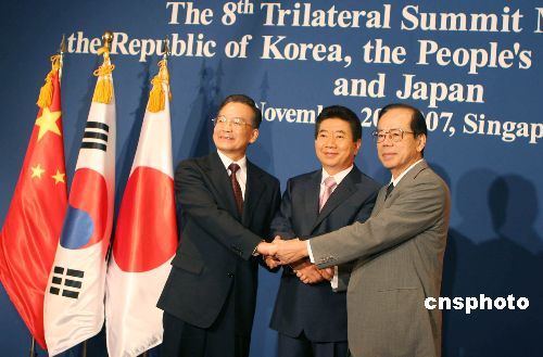 第八次中日韩领导人峰会十一月二十日上午在新加坡举行,中国国务院总理温家宝、韩国总统卢武铉、日本首相福田康夫在会上握手。中新社发 周群 摄
