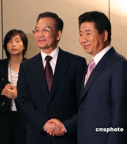 中国国务院总理温家宝十一月二十日上午在新加坡会见韩国总统卢武铉。温家宝表示,中韩在半岛及东北亚地区有着广泛的共同利益。中方愿继续保持同韩方的沟通和配合,共同推动半岛无核化进程不断取得新进展。中方将一如既往地坚定支持南北和解合作进程,将积极参与半岛和平机制的建立。中新社发 周群 摄