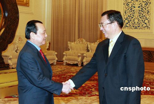 十一月二十日,中共中央政治局常委、中央纪委书记贺国强在北京人民大会堂会见越共中央政治局委员黎清海。中新社发 廖文静 摄
