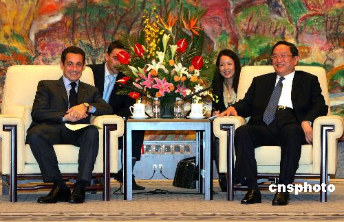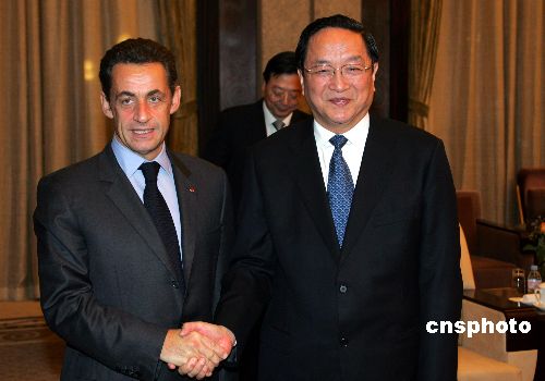 11月27日,中共中央政治局委员、中共上海市委书记俞正声,在上海西郊宾馆会见来华访问的法国总统尼古拉·萨科齐。中新社发 汤彦俊 摄