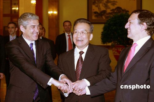十一月二十八日,北京人民大会堂,中国国务院总理温家宝会见欧盟轮值主席国葡萄牙总理苏格拉底(左)与欧盟委员会主席巴罗佐(右)。他们是前来参加第四届中欧工商峰会的。中新社发 廖文静 摄