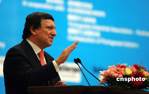 十一月二十八日,第四届中欧工商峰会在北京人民大会堂闭幕。欧盟委员会主席巴罗佐在闭幕式上作主旨讲话。中新社发 廖文静 摄