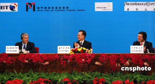 十一月二十八日,第四届中欧工商峰会在北京人民大会堂闭幕。中国国务院总理温家宝、欧盟轮值主席国葡萄牙总理苏格拉底(左)与欧盟委员会主席巴罗佐(右)共同出席闭幕式。中新社发 廖文静 摄