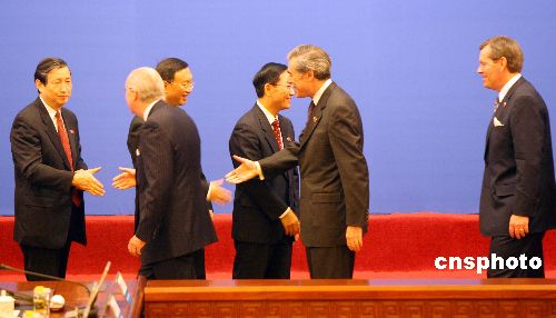 十二月十二日,第三次中美战略经济对话在北京中信国安第一城开幕。出席会议的中方代表谢旭人(财政部长)、杨洁篪(外交部长)、马凯(国家发改委主任)等(从右至左),与美方代表雷德(美国驻华大使)、古铁雷斯(商务部长)(从左至右)等握手寒暄。中新社发 毛建军 摄