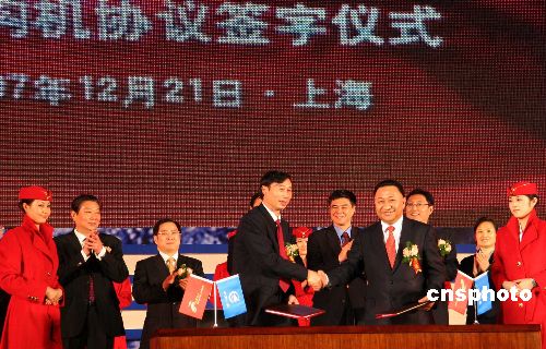 十二月二十一日下午,由中国航空工业第一集团公司(中国一航)自行研制生产的中国首架自主知识产权喷气支线客机ARJ21-700飞机,在上海飞机制造厂举行盛大的总装下线仪式。图为中国一航总经理助理、中国一商用飞机有限公司总经理罗荣怀(左四)与深圳航空公司总裁、鲲鹏航空董事长李昆在仪式上签署ARJ21飞机订购协议,后者将购买ARJ21飞机一百架,至此,该飞机已获订单一百七十一架。中新社发 孙自法 摄