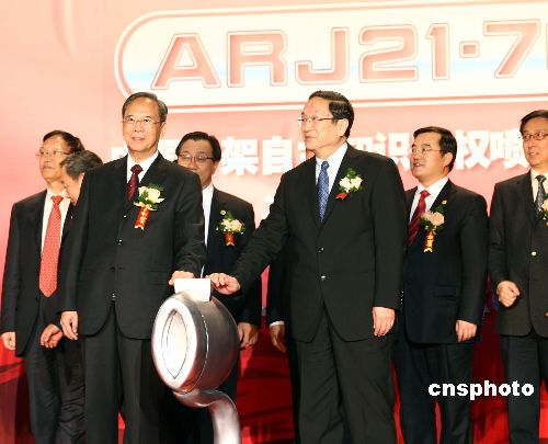十二月二十一日,由中国航空工业第一集团公司(中国一航)自行研制生产的中国首架自主知识产权喷气支线客机ARJ21-700飞机,在上海飞机制造厂顺利实现总装下线。中国国务院副总理曾培炎(前排左)和中共中央政治局委员、上海市市委书记俞正声(前排右)出席隆重的总装下线仪式。中新社发 文音 摄