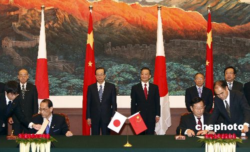 中日领导人出席双方有关合作文件的签字仪式