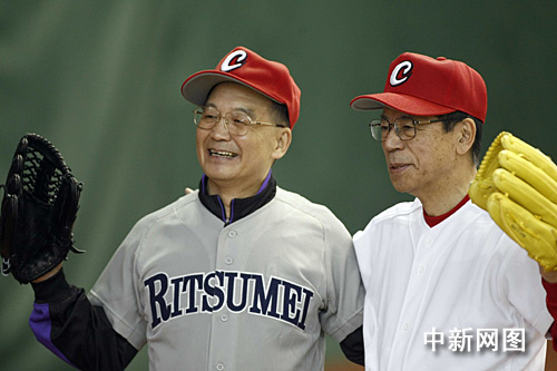 十二月二十九日,中国国务院总理温家宝与日本首相福田康夫在北京钓鱼台国宾馆内的网球馆共同练习棒球投球。作者:盛佳鹏