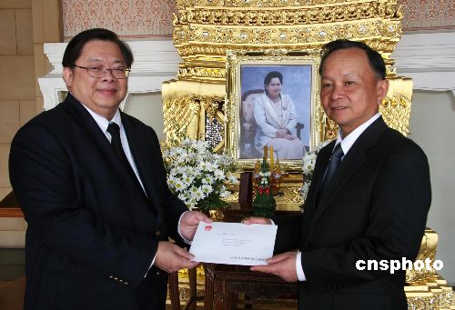 一月三日,中国国家主席胡锦涛向泰国国王普密蓬发来唁电,对泰国王姐甘拉亚妮·瓦塔娜逝世表示哀悼。当日上午,中国驻泰大使张九桓(右)通过泰国外交部转交这份唁电。中新社发 顾时宏 摄