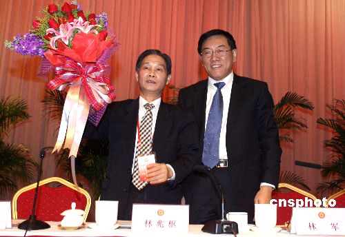 1月11日,中国侨联七届五次全委会议在北京闭幕。会议接受林兆枢辞去中国侨联主席职务、李本钧辞去副主席兼秘书长职务,选举林军为中国侨联主席,陈有庆为副主席,董中原为副主席兼秘书长,聘请林兆枢、李本钧为中国侨联顾问。图为新当选的中国侨联主席林军(右)与林兆枢合影留念。中新社发 张勤 摄