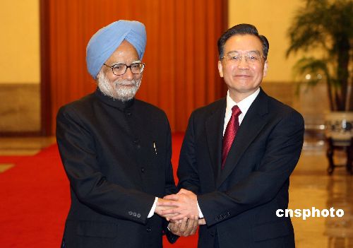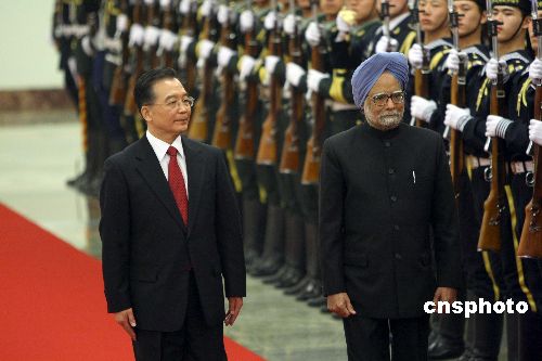 1月14日,中国国务院总理温家宝在北京人民大会堂举行仪式,欢迎来访的印度总理辛格。中新社发 盛佳鹏 摄