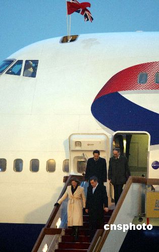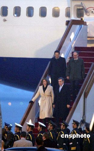 应中国国务院总理温家宝邀请,英国首相戈登·布朗1月18日清晨乘专机抵达北京,开始对中国进行为期3天的正式访问。这是布朗2007年6月就任英国首相以来首次访华,随行人员包括夫人沙拉·布朗,多位政府高级官员以及30余位随行企业家。布朗也是2008年首位访华的欧洲国家领导人。中新社发 盛佳鹏 摄