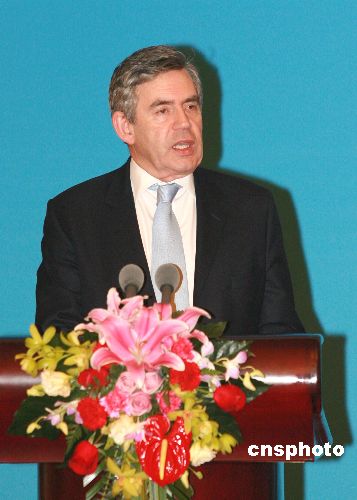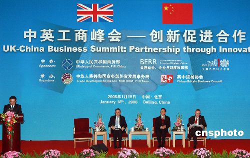 一月十八日,中国国务院总理温家宝在北京人民大会堂与英国首相布朗共同出席中英工商峰会。中新社发 廖文静 摄