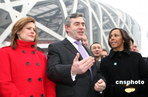 1月19日,英国首相布朗携夫人萨拉·布朗以及英国著名女运动员、雅典奥运会冠军凯莉·霍尔姆斯等,参观2008年北京奥运会主体育场“鸟巢”。北京市副市长陈刚向布朗赠送了“鸟巢”模型。中新社发 盛佳鹏 摄