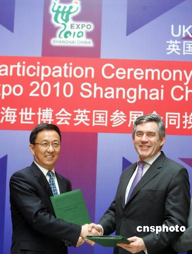 1月19日,上海市市长韩正(左)在上海会见来华访问的英国首相戈登·布朗。并与布朗互换中国二○一○年上海世博会参展文本。中新社发 汤彦俊 摄