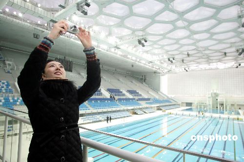 1月23日,北京市政协港澳委员及港澳台侨工作顾问等一行参观国家游泳中心——“水立方”。图为刘浩眉委员在“水立方”内拍照。 中新社发 杜燕 摄