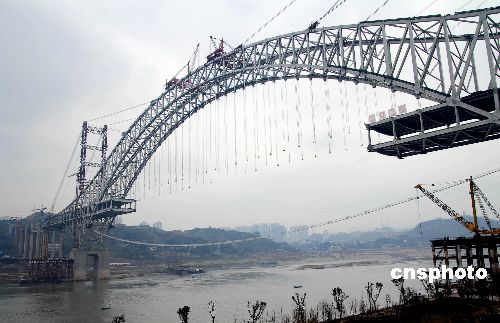 1月25日,“世界第一拱桥”的重庆朝天门长江大桥主拱合龙。大桥主跨将在今年6月合龙,并于年底竣工通车。重庆朝天门长江大桥2004年底动工,由主桥和东西引桥三部分组成,为中承式钢桁系杆拱桥,双层设计,上层为双向6车道,下层为双向轻轨和双向4条预留车道。大桥两座主墩主跨长达552米,比世界著名拱桥澳大利亚悉尼大桥的主跨还要长,成为“世界第一拱桥”。中新社发 郭晋嘉 摄