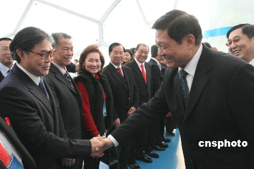 一月二十八日上午,在刚刚竣工的国家游泳中心内,北京市港澳台侨同胞共建北京奥运场馆委员会举行第八次向国家游泳中心(“水立方”)拨付捐款资金仪式。中共中央政治局委员、中共北京市委书记刘淇在仪式上与捐资人代表香港奥委会主席霍震霆握手。中新社发 王海波 摄
