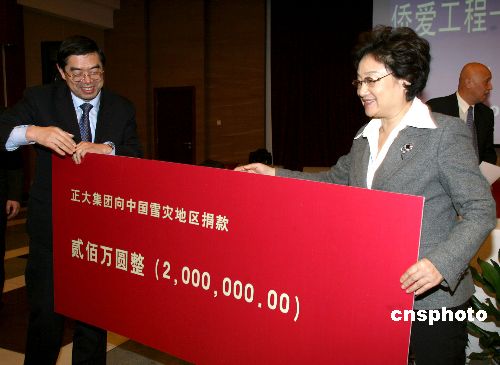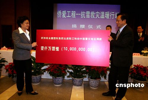 1月31日,新成立的中国侨商投资企业协会在北京发出倡议,希望广大侨商积极行动起来,为抗雪救灾伸出援助之手,得到了来自泰国、新加坡、香港、澳门等十多家侨商投资企业的积极响应。 中国侨商投资企业协会常务副会长、新加坡金鹰国际集团主席陈江和先生第一个对倡议作出响应。在国务院侨办举行的“侨爱工程——抗雪救灾温暖行动”捐赠仪式上,陈江和先生慷慨捐赠了1000万元,中国侨商投资企业协会会长、泰国正大集团董事长谢国民先生和中国侨商投资企业协会副会长、福耀玻璃工业集团董事局主席曹德旺先生分别捐赠了200万元。目前更多善款还在汇集中。这些款项将通过国务院侨办转送受灾地区人民政府。国务院侨办主任李海峰等出席捐赠仪式。中新社发 张勤 摄