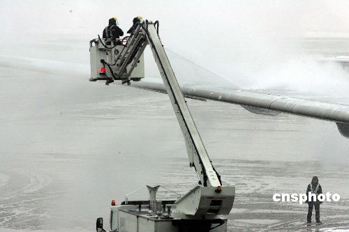 2月2日上午,2008年两岸春节包机上海航点首个航班——东航MU五00七次航班,冒着数十年未遇的罕见风雪在上海浦东机场起飞。图为浦东机场为春节包机优先提供特别的除冰服务。中新社发 潘索菲 摄