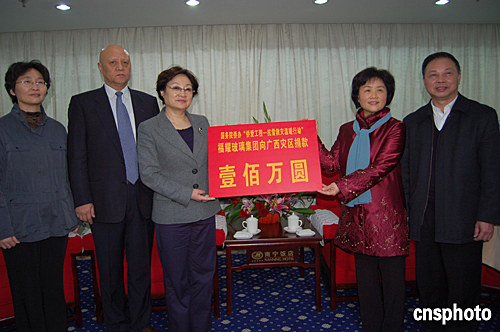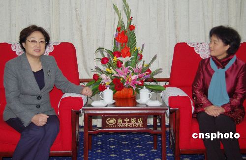 2月2日晚,在侨乡广西遭遇严重雨雪冰冻灾害急需援助之际,中国国务院侨办主任李海峰女士(左)一行从北京飞赴南宁进行慰问,并与广西自治区人大常委会副主任、广西红十字会会长刘新文进行会谈,随后李海峰代表国务院侨办和海外侨胞向广西灾区民众捐助一百万元人民币。中新社发 刘万强 摄