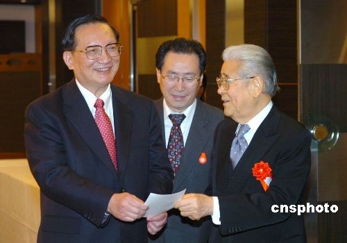 2月21日,正在日本进行访问的中国国务委员唐家璇在东京新大谷饭店会见了日本日中友协会长平山郁夫。图为平山郁夫(右)拿出三十多年前与唐家璇合照的照片,共话往昔。中新社发 滕剑峰 摄