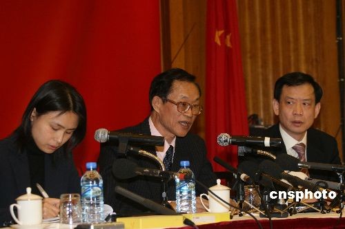 当地时间21日下午,中国政府达尔富尔问题特别代表刘贵今(中)在中国驻英使馆举行记者会,介绍中国在达尔富尔问题上的政策立场。中新社发 李鹏 摄