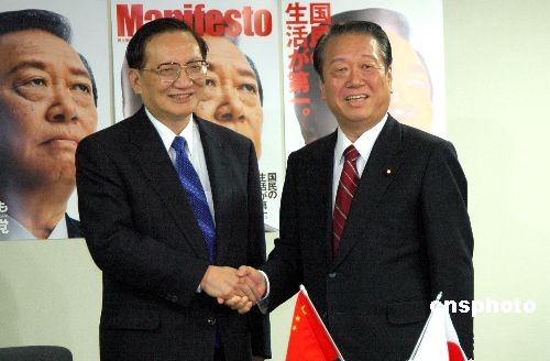 2月22日下午,正在日本进行访问的中国国务委员唐家璇在东京民主党本部会见了日本最大在野党民主党代表小泽一郎。中新社发 滕剑峰 摄