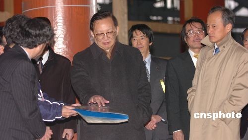2月23日下午,正在日本访问的中国国务委员唐家璇在中国驻日大使崔天凯等人的陪同下参观了大阪平城宫遗址复建工程。该工程自2001年开始动工,预计于2010年完成,将使1200多年前仿造中国唐朝大明宫修建的平城宫大极殿重现于世。图为在修建中的大极殿内参观的唐家璇一行。中新社发 朱沿华 摄