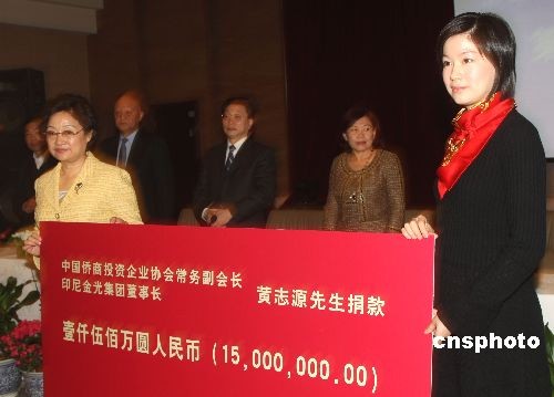 2月25日,中国国务院侨务办公室在北京举行“侨爱工程——抗雪救灾温暖行动”第二次捐赠活动,国务院侨务办公室主任李海峰(左)在仪式上接受来自海内外的捐款。截至到目前,海内外侨胞已捐善款1.3亿元人民币,捐赠救灾物资价值4000多万元人民币,总计达1.7亿元人民币。中新社发 赵振清 摄