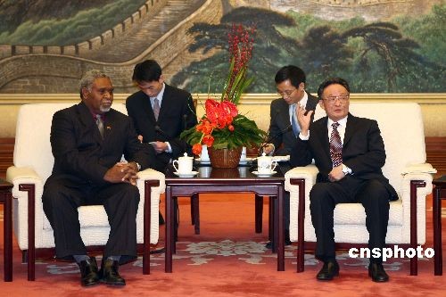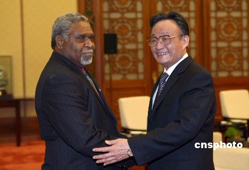 2月25日,中国全国人大常委会委员长吴邦国在北京人民大会堂会见瓦努阿图议长阿沃克。中新社发 盛佳鹏 摄