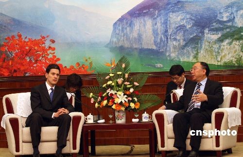 2月26日,英国外交大臣戴维·米利班德一行抵渝进行访问。据称,此次访问重点是了解重庆市政府在缩小城乡差距领域所作出的努力,戴维·米利班德一行将实地走访重庆建筑工地和农村,了解当地农民、农民工及其子女的生活教育状况。图为重庆市常务副市长黄奇帆(右一)会见戴维·米利班德(左一)。中新社发 郭晋嘉 摄