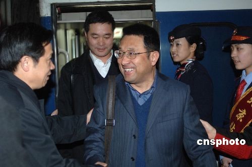 二月二十八日清晨,参加全国政协十一届一次会议的吉林委员乘坐火车抵达北京,他们是首批抵京的京外委员。中新社发 廖攀 摄