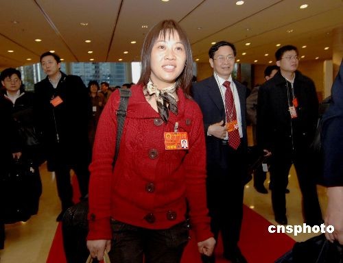 三月二日下午近六时,中国农民工全国人大代表胡小燕(女),随广东代表团抵达北京,出席即将于五日开幕的十一届全国人大一次会议。三十四岁的胡小燕十年前从四川来到改革开放前沿的广东省打工,现在是佛山市三水新明珠建陶工业有限公司成品车间副主任,曾荣膺佛山市“十佳外来工”。中新社发 王东明 摄