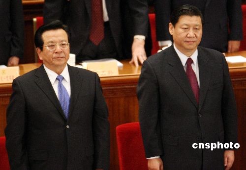 3月3日下午,全国政协十一届一次会议在北京人民大会堂开幕,国家副主席曾庆红(左)、中共中央政治局常委习近平出席。中新社发 任晨鸣 摄