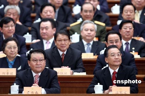 3月3日下午,全国政协十一届一次会议在北京人民大会堂开幕,中共中央政治局常委、国务院总理温家宝,中共中央政治局常委李长春出席。中新社发 盛佳鹏 摄
