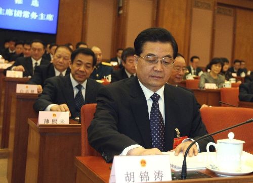3月4日上午,第十一届全国人民代表大会第一次会议在北京人民大会堂举行预备会议后,举行大会主席团第一次会议,胡锦涛出席会议并按表决器进行表决。中新社发 任晨鸣 摄