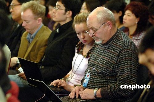 三月四日,俄罗斯等国记者在中国全国人大新闻发布会上认真进行记录。当日上午,十一届全国人大一次会议首场新闻发布会在北京人民大会堂举行,超过八百名境外记者报名采访中国“两会”。中新社发 王东明 摄