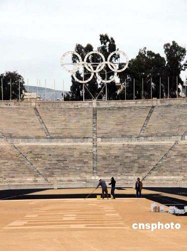 北京奥运会圣火采集和火炬传递的筹备工作正在希腊紧张地进行中。图为雅典第一届现代奥运会会场正在为即将于本月底举行的火炬交接仪式做准备,工人正在体育场中心铺设奥运五环标志。该体育场能容纳两万人。中新社发 钟诚 摄