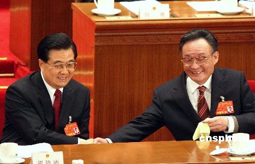 3月8日,十一届全国人大一次会议第二次全体大会在北京人民大会堂举行,受十届全国人大常委会委托,吴邦国委员长作常委会工作报告。图为报告结束后,胡锦涛与吴邦国握手。中新社发 张宇 摄