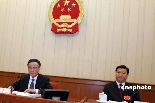 3月11日,十一届全国人大一次会议主席团在北京举行第二次会议,吴邦国主持会议,习近平出席。中新社发 任晨鸣 摄