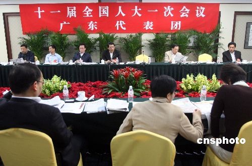 3月12日,参加十一届全国人大一次会议的广东代表团举行小组会议,审议国务院机构改革方案。中新社发 张宇 摄