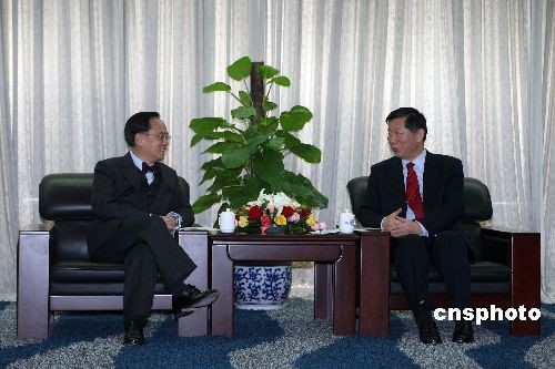 3月18日,香港特别行政区行政长官曾荫权在北京先后拜访了中国人民银行和中国证券监督管理委员会。图为曾荫权与中国证监会主席尚福林交谈。中新社发 盛佳鹏 摄