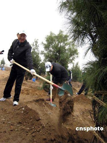 3月22日,来自中国国务院各部门的172名部级领导在北京郊区门头沟区挥锹铲土,栽下了白皮松、银杏、国槐、栾树等30多个树种2000多株树木,为绿色奥运再添新绿。图为外交部部长杨洁篪在为树苗填土。中新社发 于立霄 摄