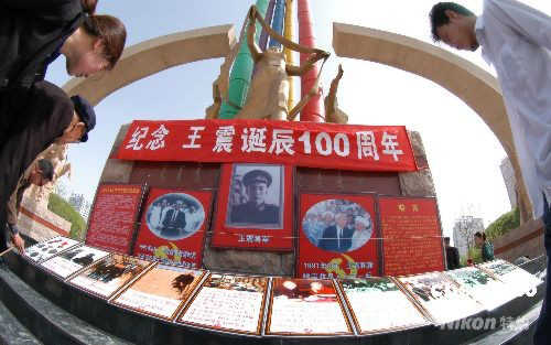 4月11日下午,是王震同志诞辰100周年纪念日。新疆巴州红色收藏家陈伯寿在库尔勒人民广场免费展出王震图片和资料。当日,新疆各地州举办座谈会、展出王震图片和资料等形式纪念王震同志诞辰100周年。中新社发 确·胡热 摄