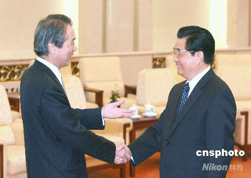4月16日,中国国家主席胡锦涛在北京人民大会堂会见以自民党干事长伊吹文明、公明党干事长北侧一雄为团长的日本执政党代表团。期间,伊吹文明向胡锦涛主席转交了日本首相福田康夫的亲笔信函。中新社发 廖文静 摄
