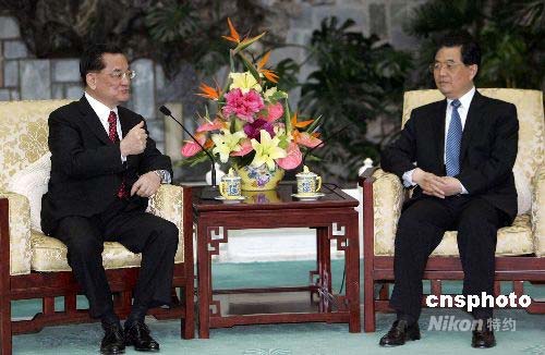 4月29日下午,中共中央总书记胡锦涛,在北京钓鱼台会见中国国民党荣誉主席连战。中新社发 任晨鸣 摄