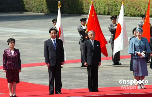 5月7日,日本明仁天皇与皇后美智子在皇宫为正在日本进行国事访问的中国国家主席胡锦涛及夫人刘永清举行了欢迎仪式。图为天皇夫妇与胡锦涛夫妇在欢迎仪式上。中新社发 朱沿华 摄