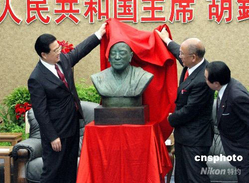 正在日本进行国事访问的国家主席胡锦涛,十日与奈良地方官员一起为鉴真大师铜像揭幕。中新社发 陈超 摄