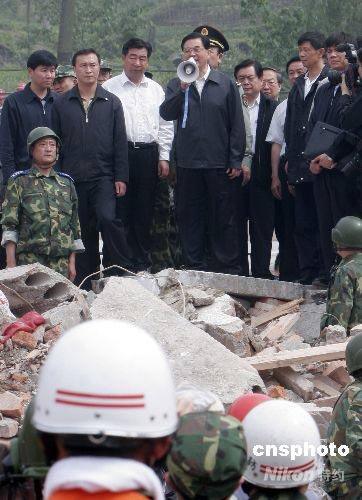 5月18日,中共中央总书记、国家主席、中央军委主席胡锦涛来到四川什邡市鎣华镇救灾抢险现场察看灾情,对当前救灾工作提出要求,向参与现场救援的抢险救援突击队和空降兵某部官兵表示慰问。中新社发 张晓理 摄